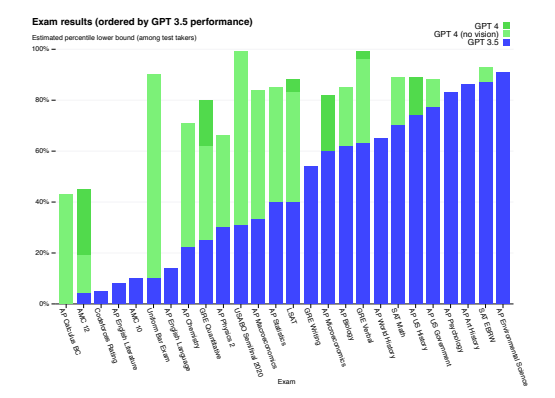 Chatbots are nothing new, but this is an evolved genius gigabrain chatbot. It can quickly give you the answer to almost any question, it can write code that builds games and iPhone apps, it can recommend recipes from a photo of one’s fridge and organise your estimated taxes. And we can only expect it to get better. Just look at how much better GPT-4 performs across a wide array of exams compared to GPT-3.5